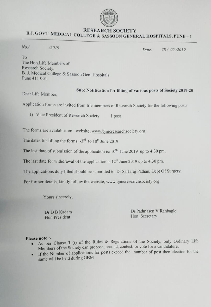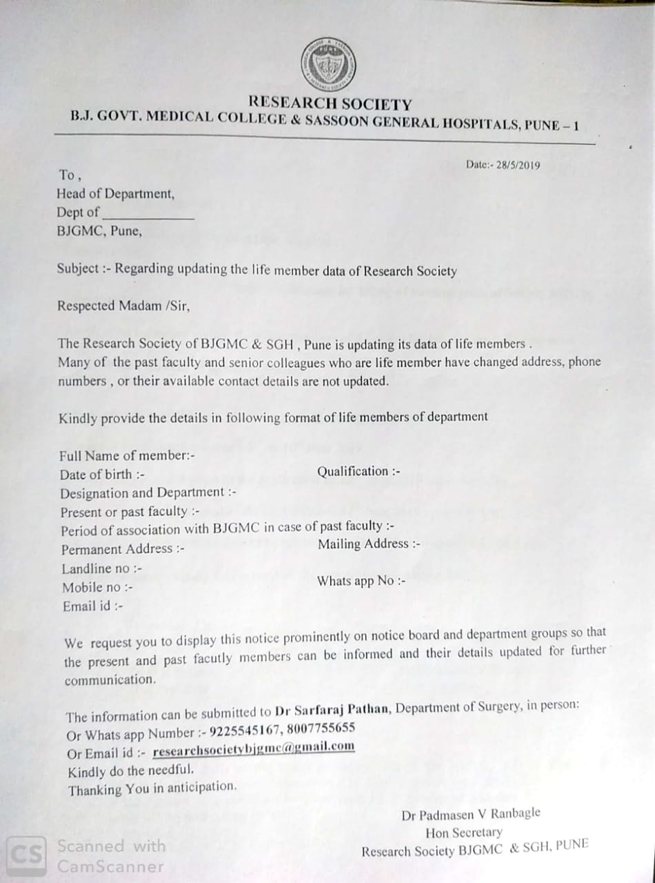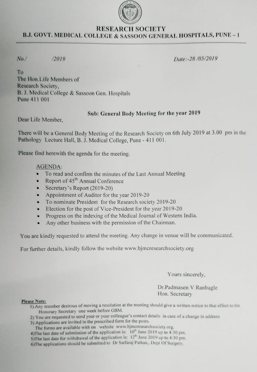 Dear members , I have taken over as Secretary of the research society of BJMC and SGHs .It gives me great pleasure to invite all of you to the 41 st annual conference of our society being organised by the dept of Dentistry and physiotherapy.900 delegates have registered for the conference and we have arranged a magnificent scientific programme. I request you all to check the list of life members and confirm your present residential address.If there is any change please communicate to me in writing so that the list can be updated.Please attend the annual general body meeting on 12th of February 2015 at 6 pm in M.G.Auditorium Dr.H.B.Prasad